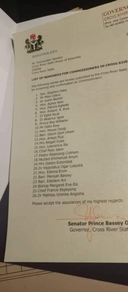The Cross River State governor, Sen. Bassey Otu has forwarded 26 names to the State House of Assembly for possible confirmation as commissioners.