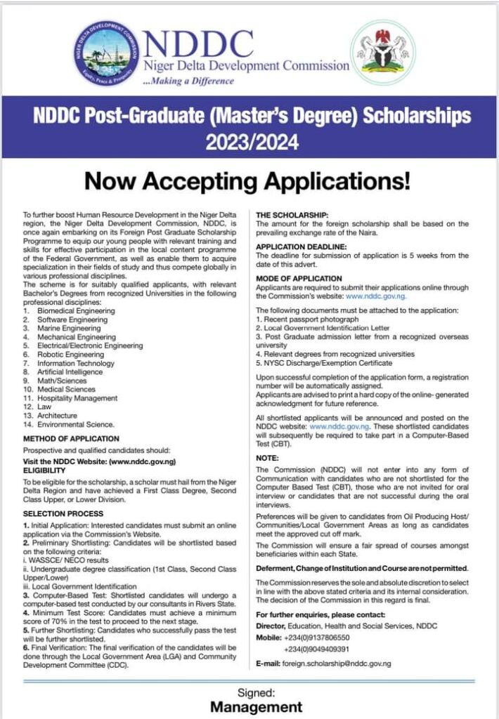The Niger Delta Development Commission (NDDC) has called for qualified persons to apply for its 2023/24 foreign post-graduate scholarship progamme.