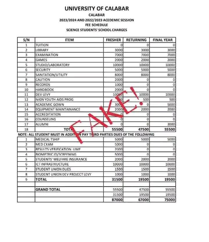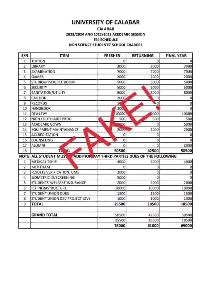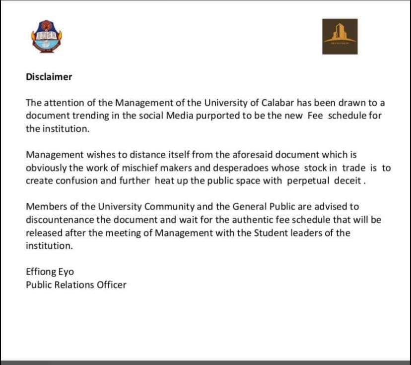 “The attention of the Management of the University of Calabar has been drawn to a document trending in the social Media purported to be the new Fee schedule for the institution.