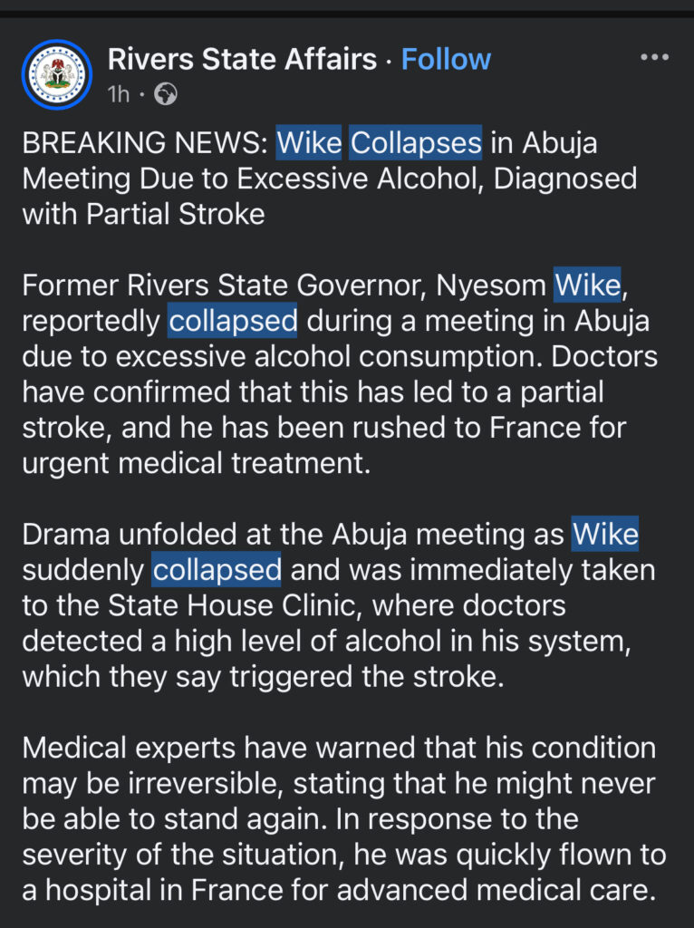 There is a reporting currently circulating on Social Media that the FCT Minister, Chief Nyesom Wike collapsed during his meeting with the Body of Benchers today in Abuja.