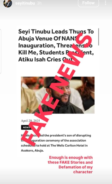 But, reacting to the allegations on Tuesday via his official Instagram handle, Seyi Tinubu dismissed the claims as entirely baseless and defamatory. He wrote, “Enough is enough with these fake stories and defamation of my character.” The message was accompanied by a screenshot of the report, which he labelled as “fake news.”