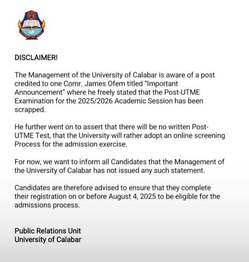 The University of Calabar management has reacted to a widespread publication which announced that the varsity has scrapped Post-UTME exercise for candidates seeking admission into the school’s 2025/26 academic session.